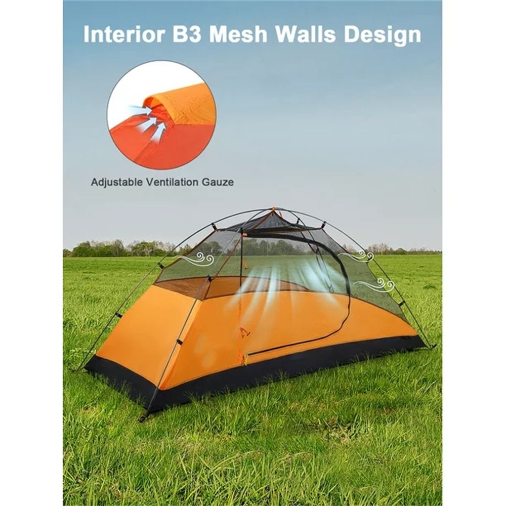 The 1-person backpacking tent is designed for a roomy and convenient experience. The camping tent with an interior center height of 44 inches and 96 x 64 (38+26) inches base dimensions; is a spacious camp tent with plenty of space for you. To keep your camp equipment dry; the sturdy polyester material on the outdoor camp tent body and the removable rainfly help to ensure the feature of waterproof for dry travel. Interior B3 Mesh Wall and adjustable ventilation gauze of the backpacking tent are designed for enhanced airflow. A D-style door of the camping tent will keep an open view. Also; the 1-person backpacking tent comes with an inner storage mesh that helps keep the inside of the camp tent organized. The hiking camp tent is equipped with 4 wind ropes and 10 stakes for safety and stability. It only takes you 3 minutes to set up. The carry bag weighs only 4.84 lbs. A lightweight tent can be stored in the car without taking up much space. No need to waste nice camping time to set up this backpacking tent. When you finish your trip; you can simply place components back into the carry bag to pack up and transport. The good design of the backpacking hiking tent makes the ultralight tent suitable for outdoor; hiking; traveling; fishing; etc.