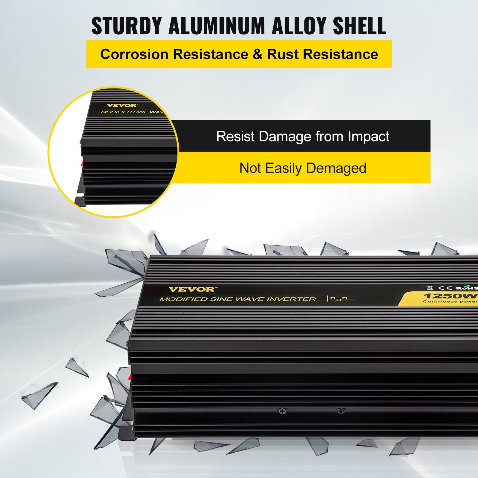 1.Aluminum Alloy Shell & LED: 1250W modified sine wave inverter adopts an aluminum alloy shell to resist heat, cold, and corrosion, which is not easy to rust. The LED indicator light is convenient for users to master the power inverter working promptly.