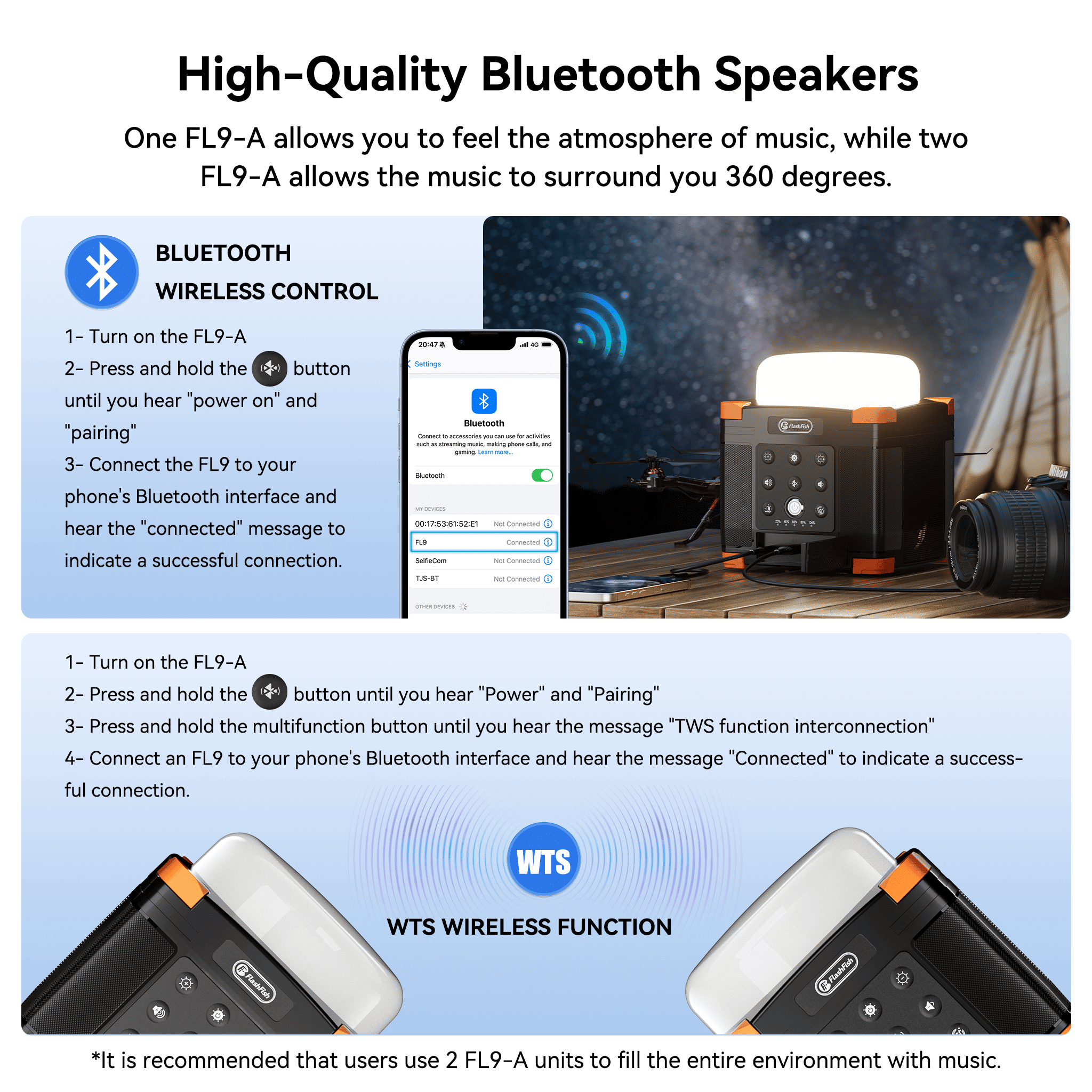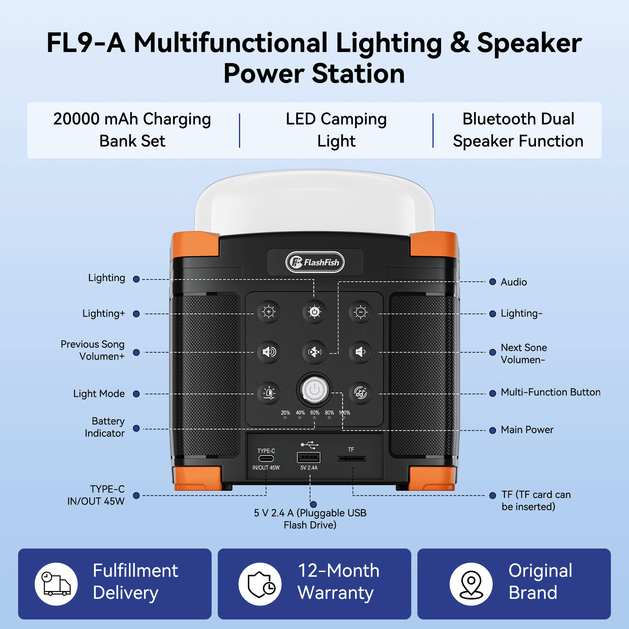 Home > Flashfish FL9-A Multi-function Bluetooth Speaker | 56Wh Power Bank | Camping Light, 360° Surround Sound, USB-C, Bluetooth 5.0